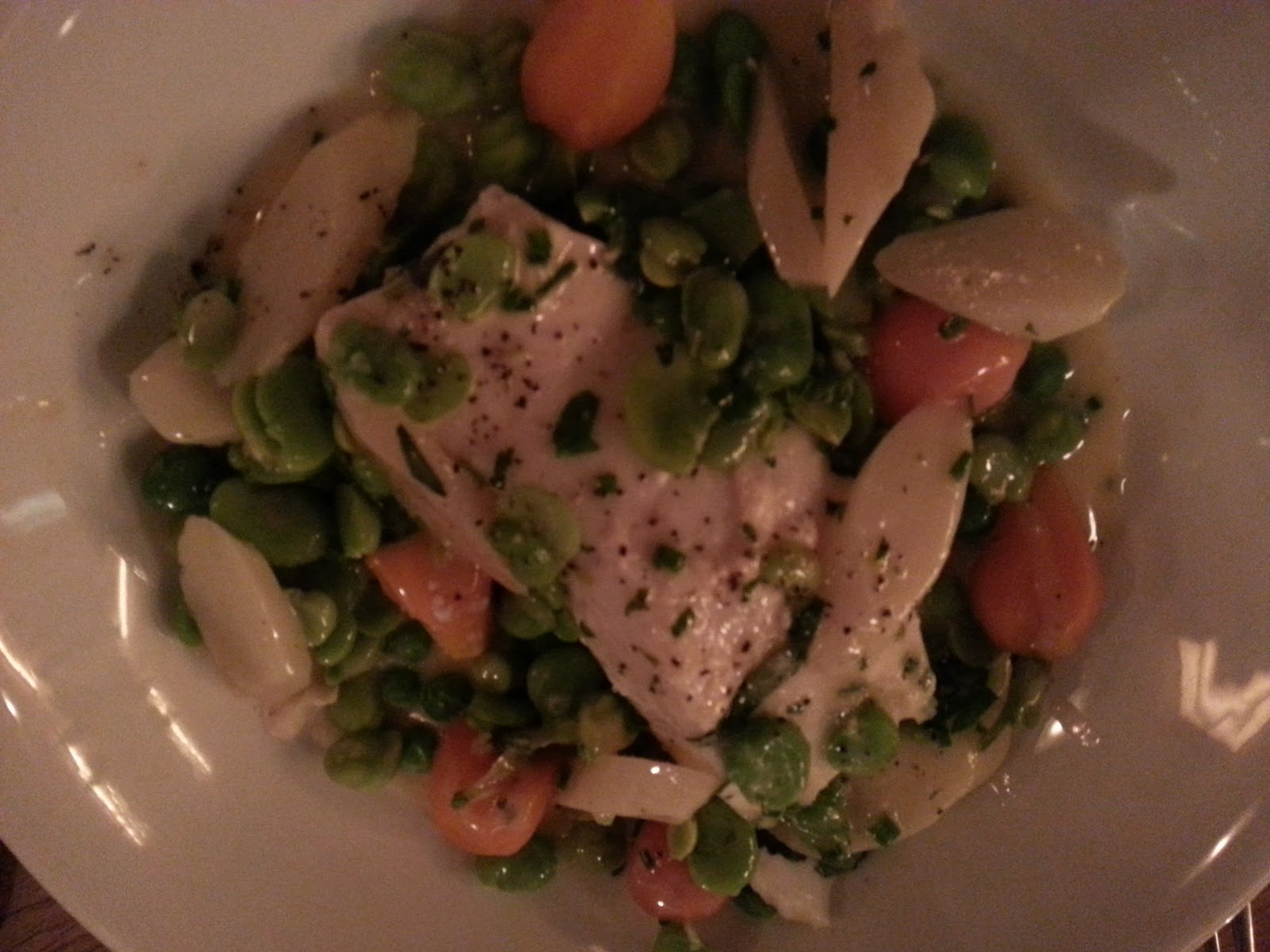 A lovely salad to start, gorgeous poached halibut in beurre blanc, a